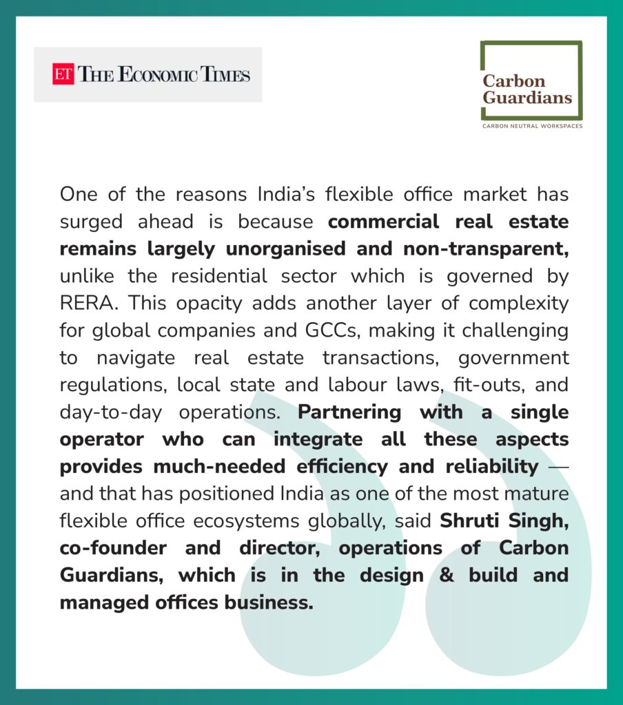 India has emerged as a global leader in flexible and carbon-neutral office ecosystems. Shruti Singh of Carbon Guardians explains how integrated solutions combining real estate, design, fit-outs, and operations are driving transparency, sustainability, and scalability for GCCs and enterprises. With carbon-tracked materials, modular builds, and managed performance, India now sets the benchmark for efficiency and environmental responsibility in commercial workspaces, positioning itself as the world’s most advanced and mature flexible office market.